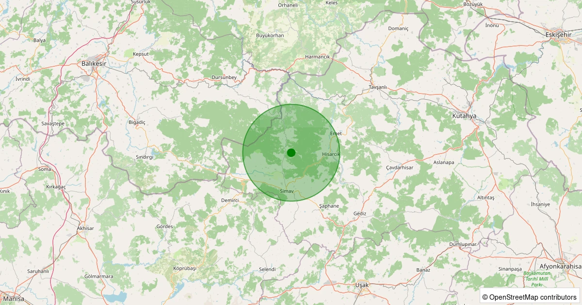 Son 7 gün içinde Simav - Yeşildere Köyü noktasından 100 km yarıçap içerisinde meydana gelen diğer depremler: