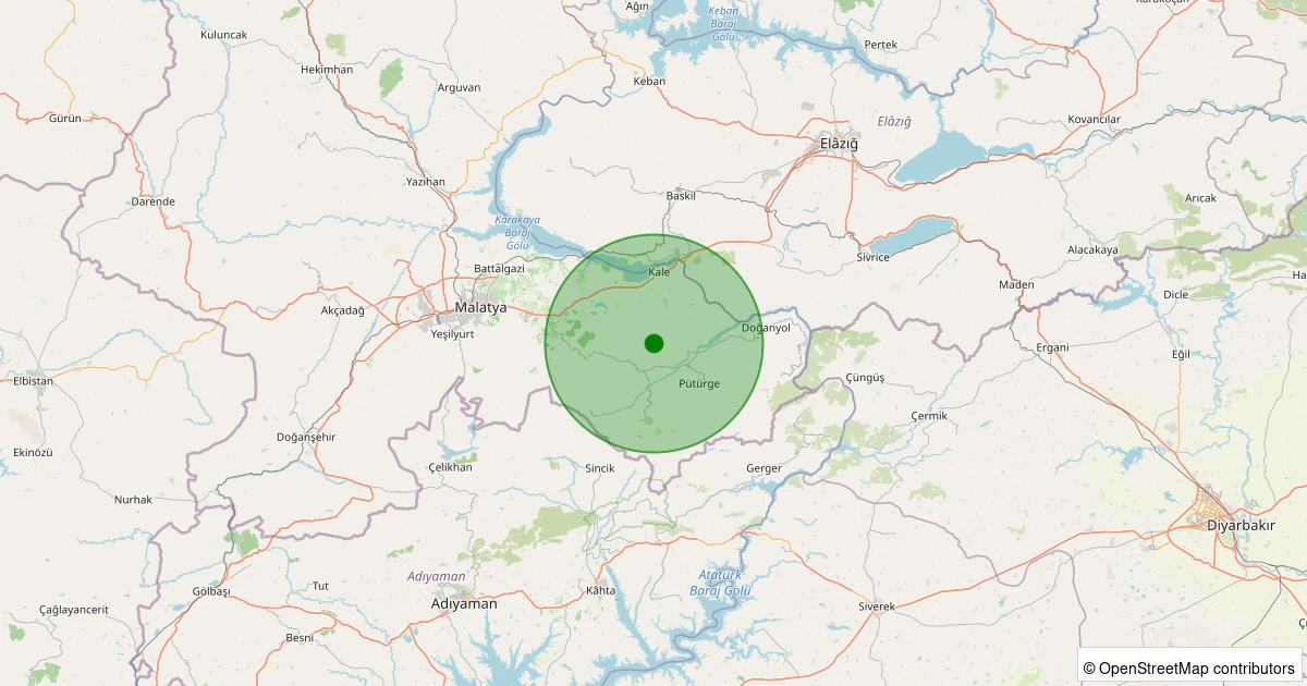 Son 7 gün içinde Pütürge - Pazarcık Köyü noktasından 100 km yarıçap içerisinde meydana gelen diğer depremler: