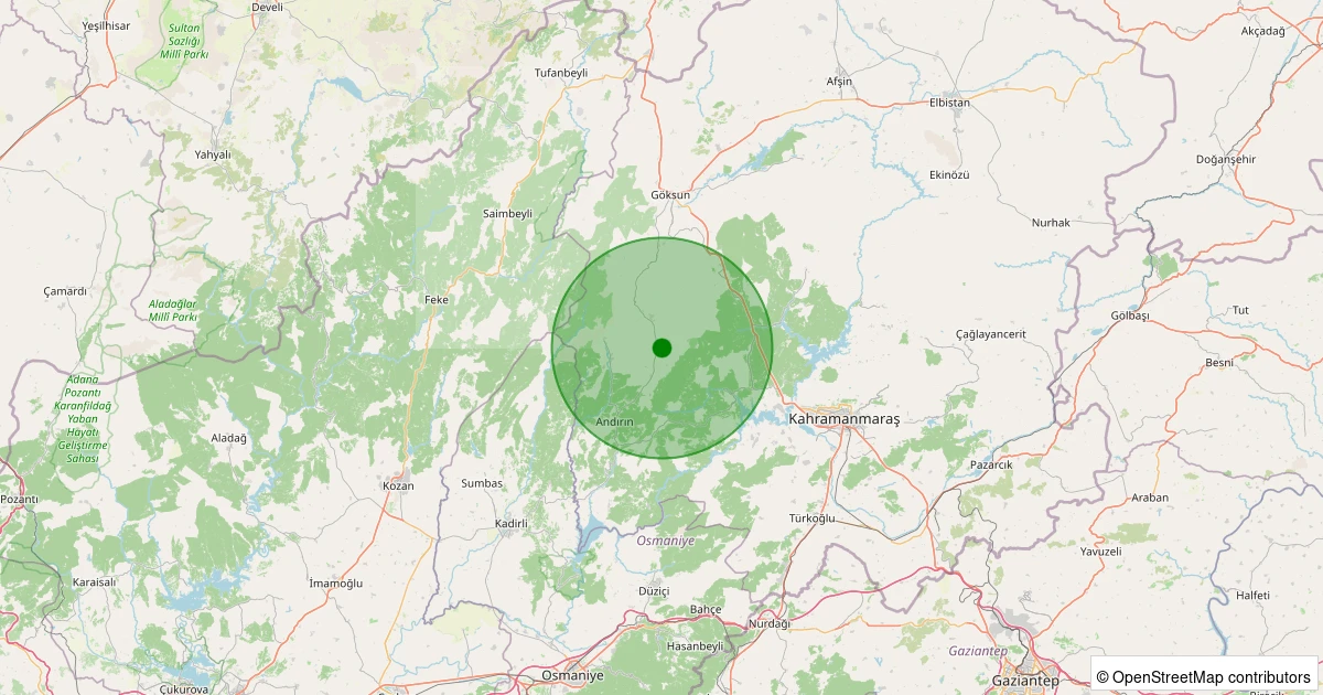 Son 7 gün içinde Andırın - Geben Köyü noktasından 100 km yarıçap içerisinde meydana gelen diğer depremler: