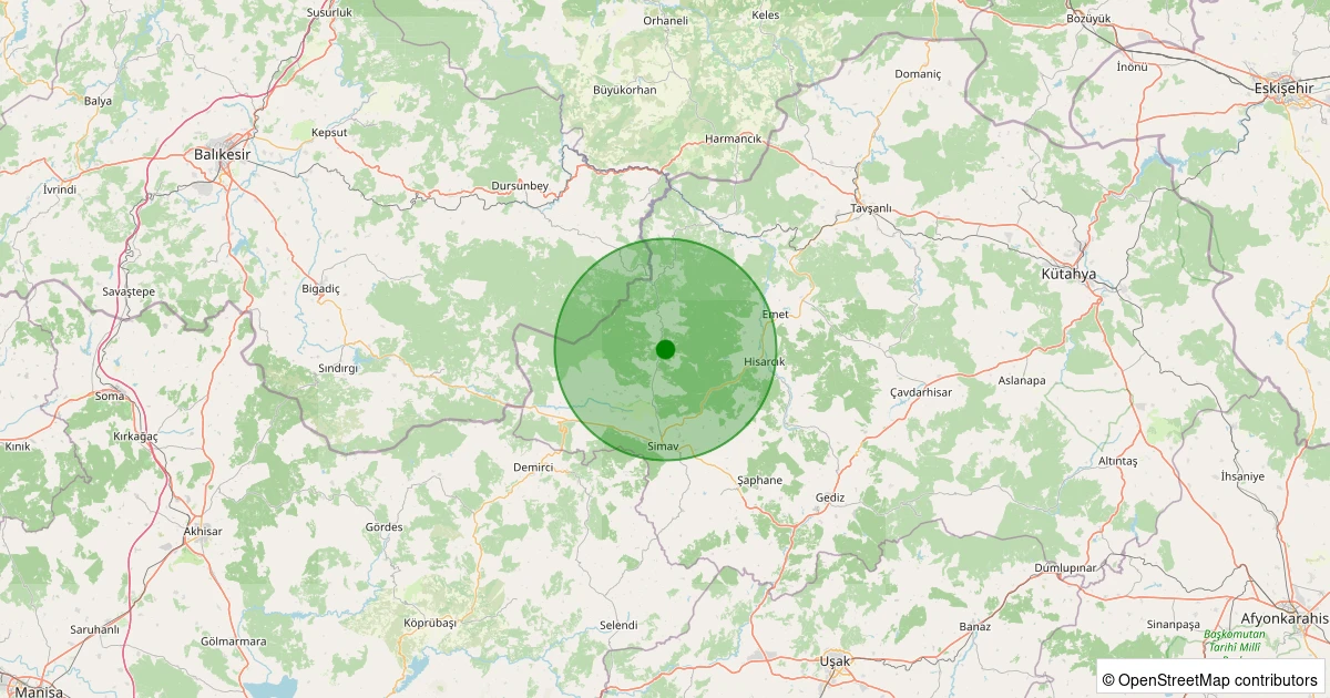 Son 7 gün içinde Simav - Yeşildere Köyü noktasından 100 km yarıçap içerisinde meydana gelen diğer depremler: