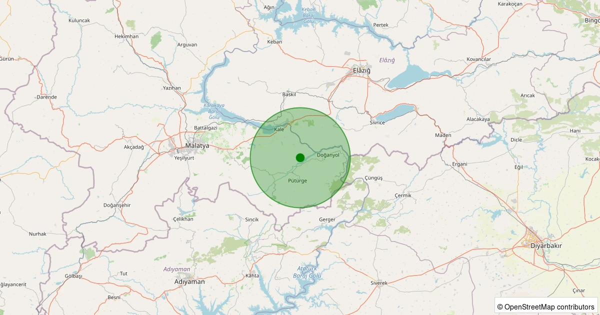 Son 7 gün içinde Pütürge - Tatlıcak Köyü noktasından 100 km yarıçap içerisinde meydana gelen diğer depremler: