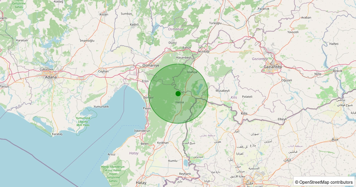 Son 7 gün içinde Hassa - Yeniyapan Köyü noktasından 100 km yarıçap içerisinde meydana gelen diğer depremler: