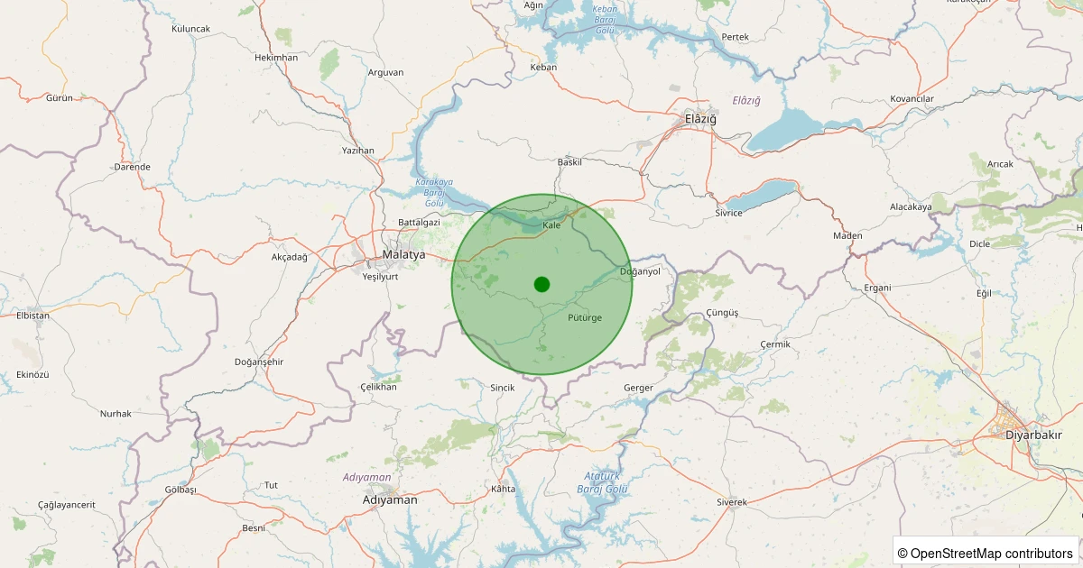 Son 7 gün içinde Pütürge - Pazarcık Köyü noktasından 100 km yarıçap içerisinde meydana gelen diğer depremler: