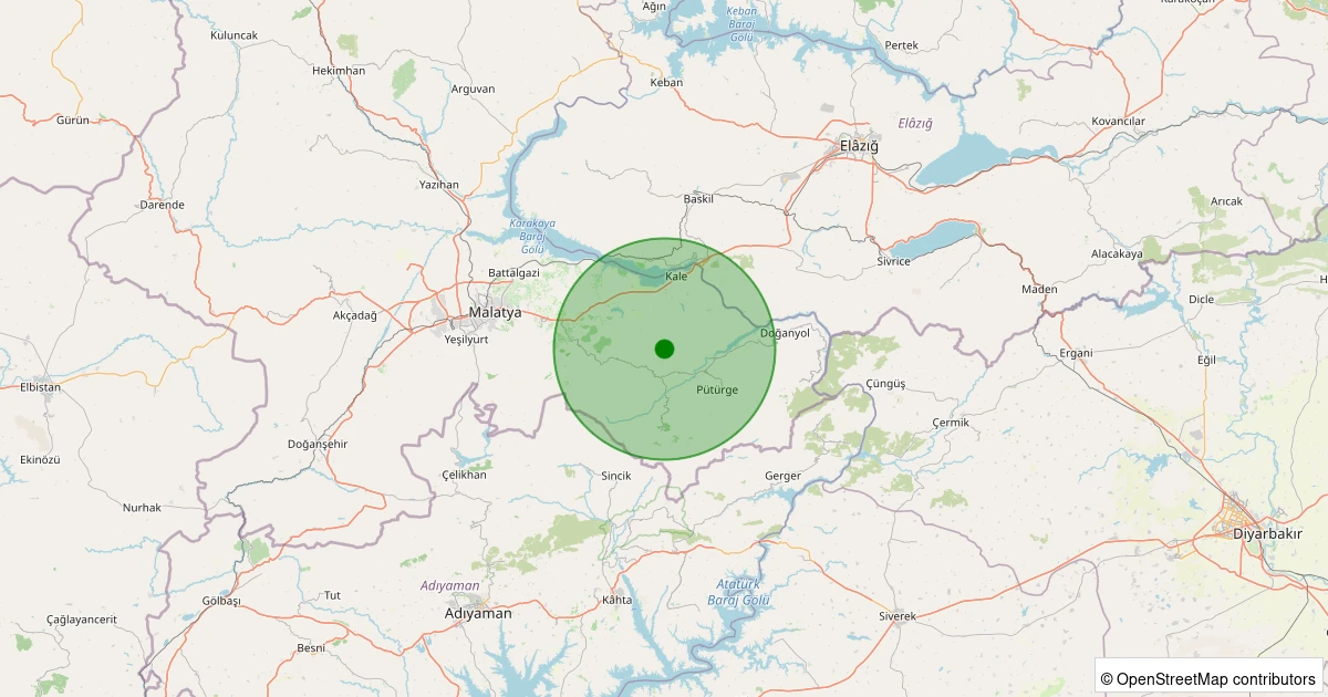 Son 7 gün içinde Pütürge - Pazarcık Köyü noktasından 100 km yarıçap içerisinde meydana gelen diğer depremler: