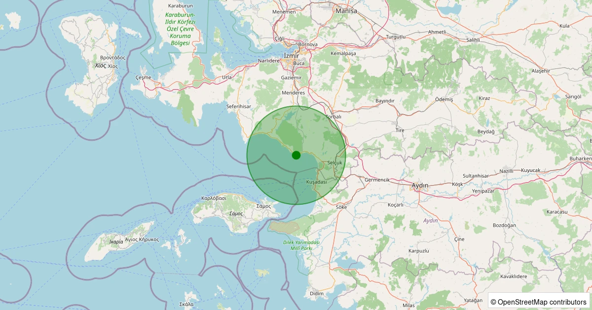 Son 7 gün içinde Ege Denizi - Kuşadası Körfezi - [04.45 km] Menderes (İzmir) noktasından 100 km yarıçap içerisinde meydana gelen diğer depremler: