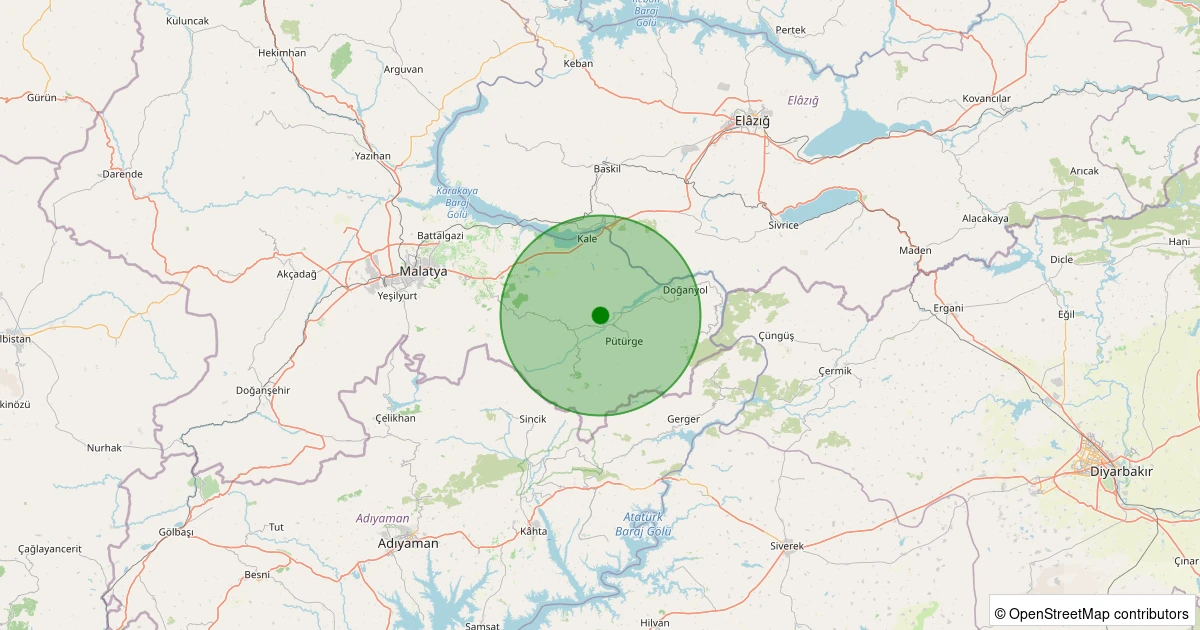 Son 7 gün içinde Pütürge - Pazarcık Köyü noktasından 100 km yarıçap içerisinde meydana gelen diğer depremler: