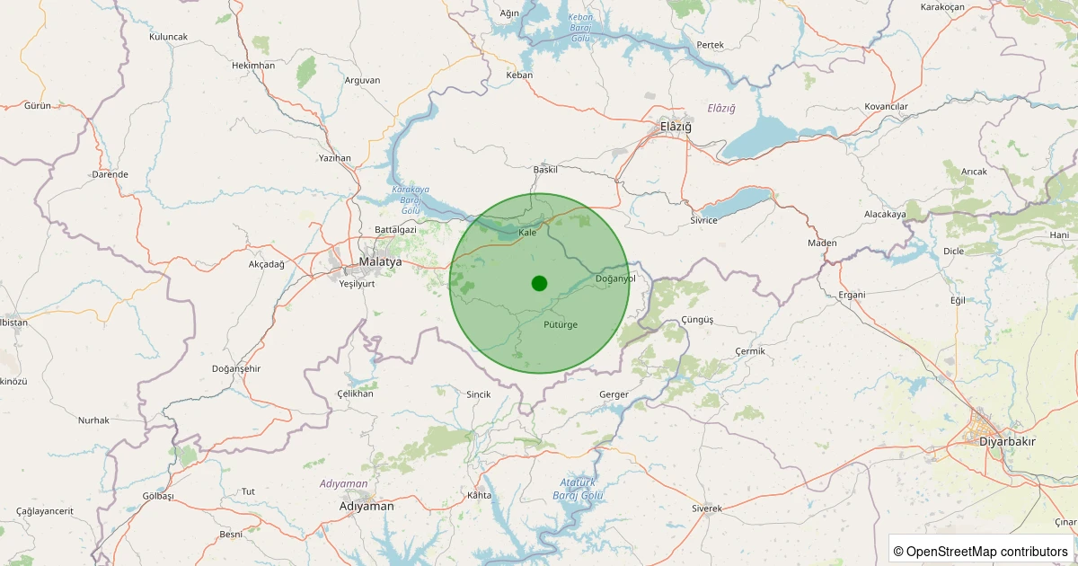 Son 7 gün içinde Pütürge - Karşıyaka Köyü noktasından 100 km yarıçap içerisinde meydana gelen diğer depremler: