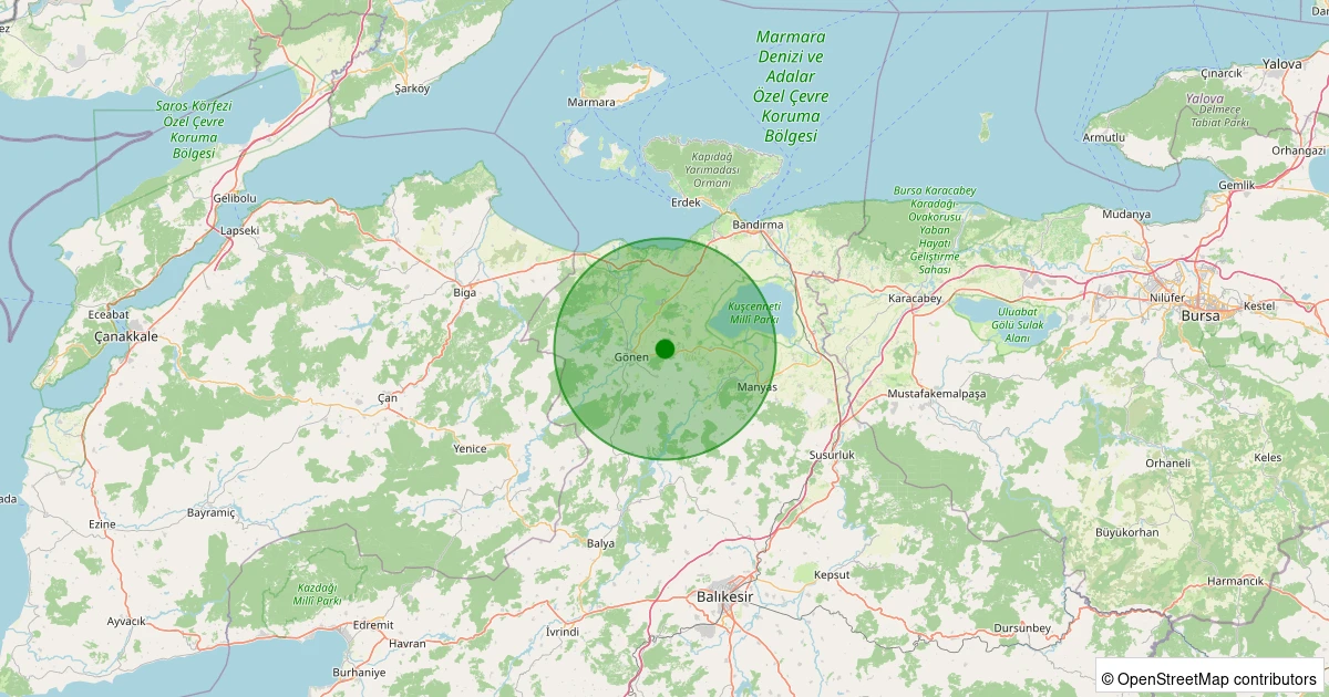 Son 7 gün içinde Gönen - Kalfaköy noktasından 100 km yarıçap içerisinde meydana gelen diğer depremler: