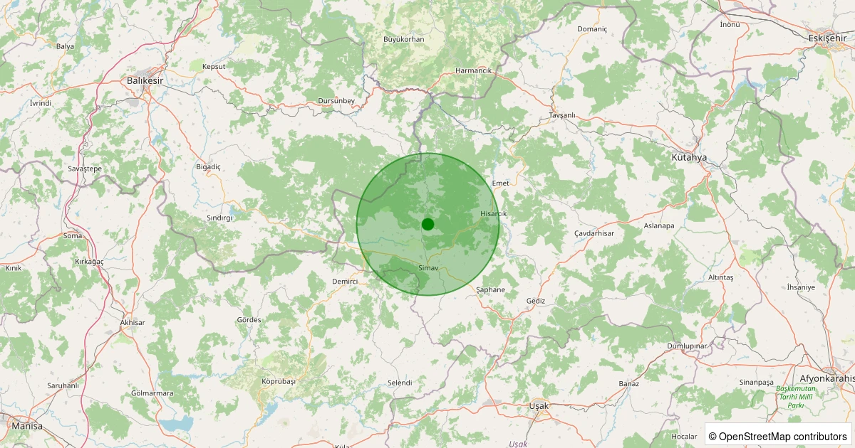 Son 7 gün içinde Simav - Yemişli Köyü noktasından 100 km yarıçap içerisinde meydana gelen diğer depremler: