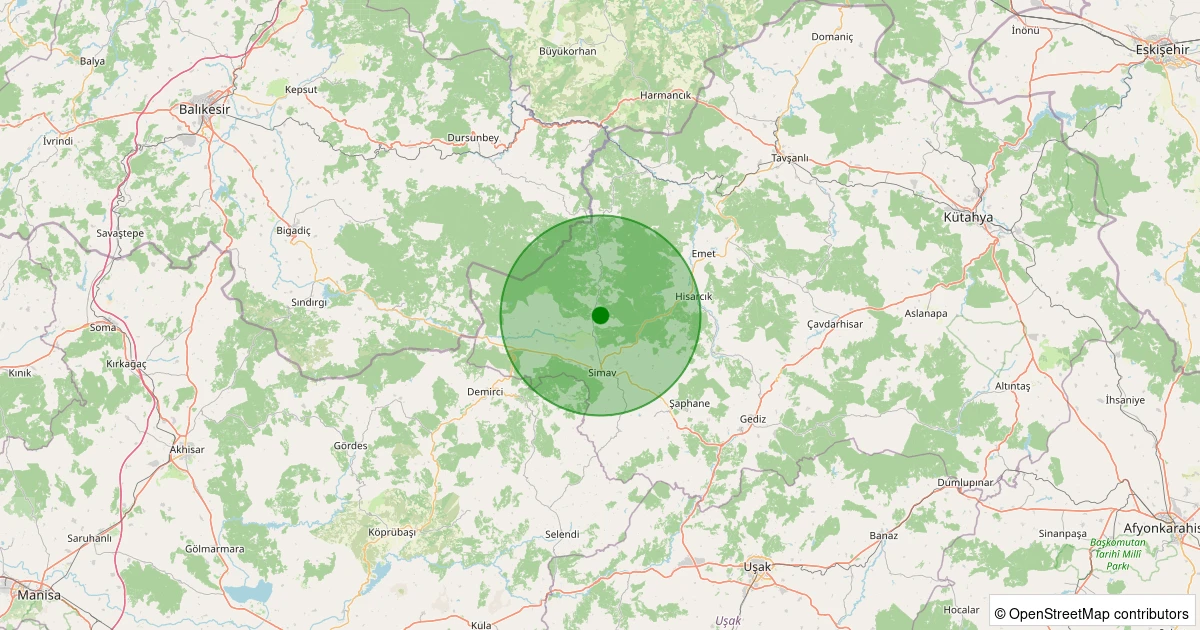 Son 7 gün içinde Simav - Yemişli Köyü noktasından 100 km yarıçap içerisinde meydana gelen diğer depremler: