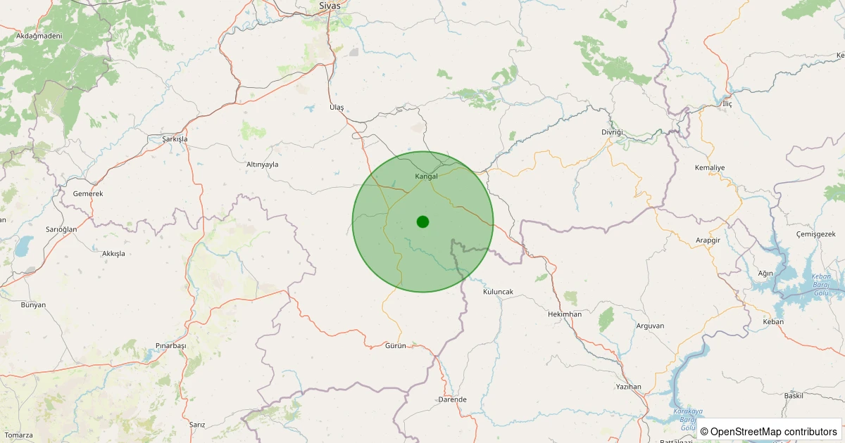 Son 7 gün içinde Kangal - Kırkpınar Köyü noktasından 100 km yarıçap içerisinde meydana gelen diğer depremler: