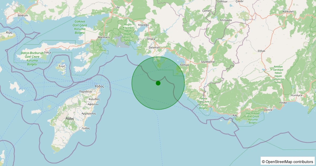 Son bir hafta içerisinde Akdeniz - [24.90 km] Fethiye (Muğla) noktasından 100 km yarıçap içerisinde toplamda 114 deprem kaydedilmiştir. Bu depremlerden en büyüğü 3.7 büyüklüğünde ve en sığ odaklısı 2.80 kilometre derinlikte gerçekleşmiştir.