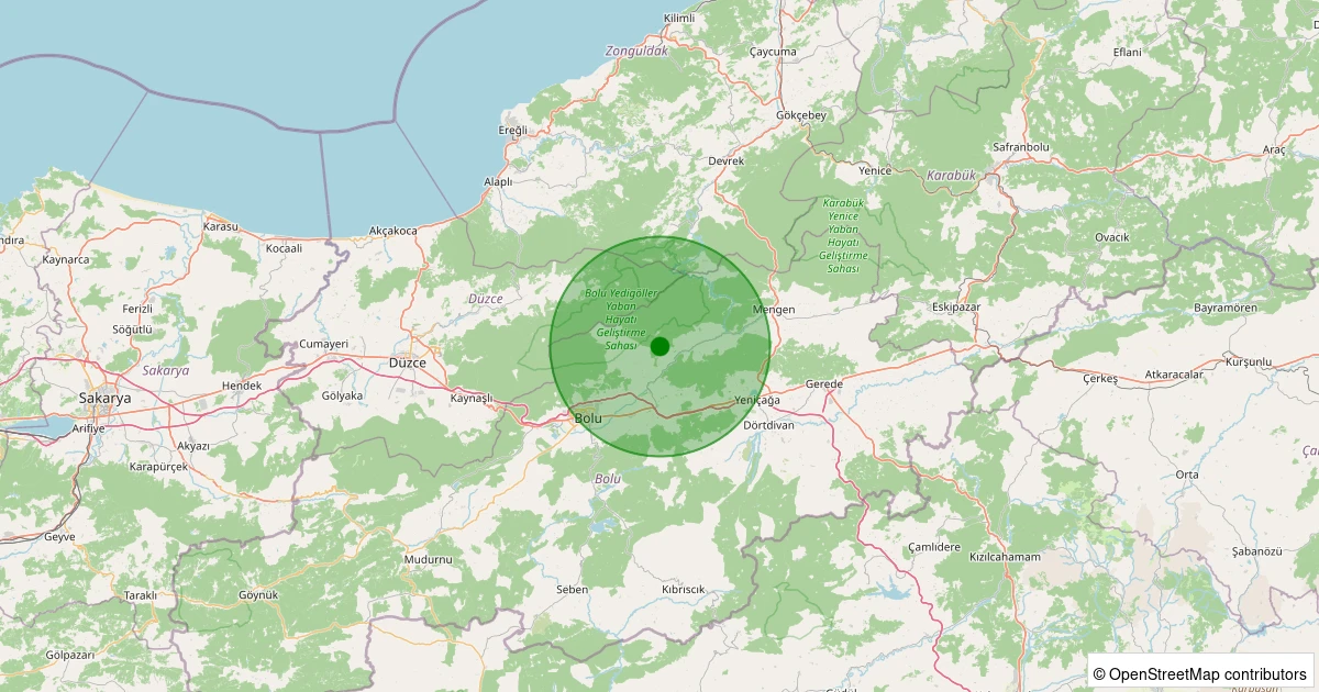 Son bir hafta içerisinde Bolu şehri Merkez noktasından 100 km yarıçap içerisinde toplamda 57 deprem kaydedilmiştir. Bu depremlerden en büyüğü 2.6 büyüklüğünde ve en sığ odaklısı 0.00 kilometre derinlikte gerçekleşmiştir.