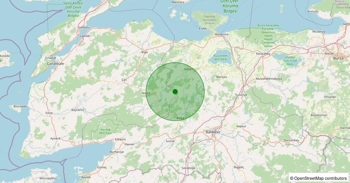 Son 7 gün içinde Gönen - Fındıklı noktasından 100 km yarıçap içerisinde meydana gelen diğer depremler: