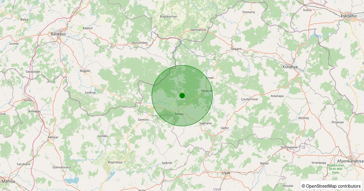 Son 7 gün içinde Simav - Yemişli Köyü noktasından 100 km yarıçap içerisinde meydana gelen diğer depremler: