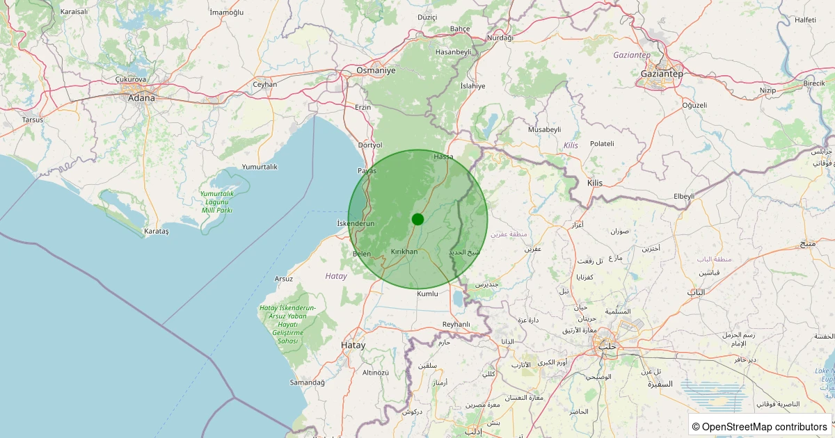 Son 7 gün içinde Kırıkhan - Saylak Köyü noktasından 100 km yarıçap içerisinde meydana gelen diğer depremler: