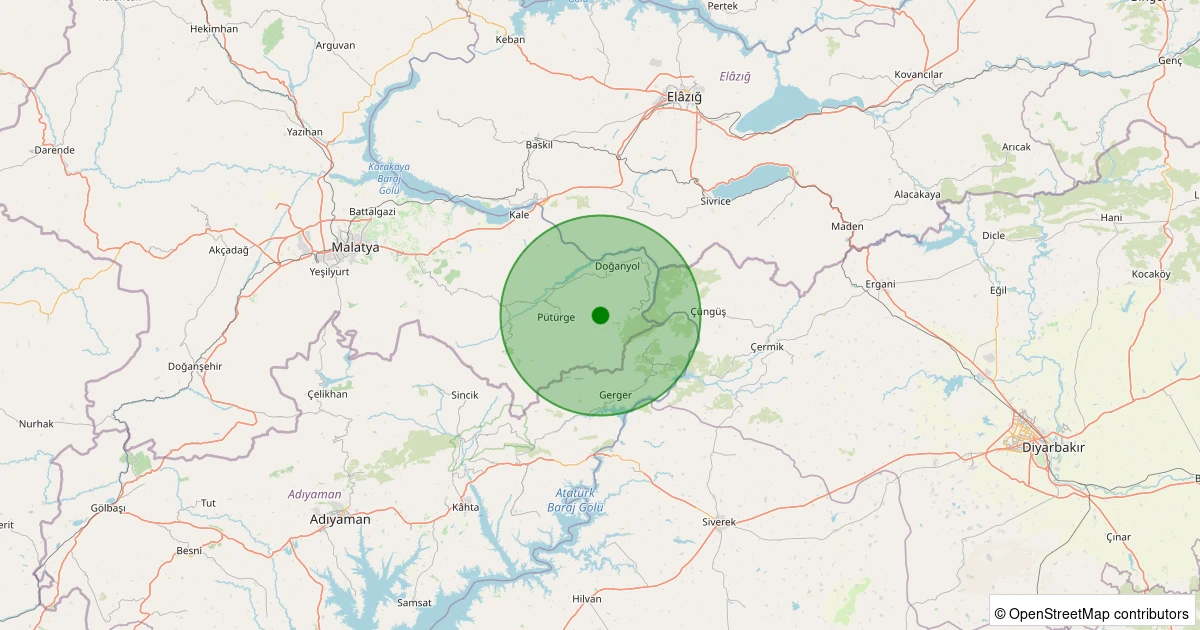 Son 7 gün içinde Pütürge - Uzunkoru Köyü noktasından 100 km yarıçap içerisinde meydana gelen diğer depremler:
