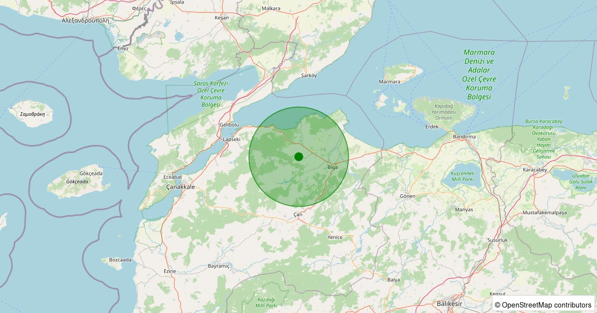 Son 7 gün içinde Biga - Kozçeşme Köyü noktasından 100 km yarıçap içerisinde meydana gelen diğer depremler: