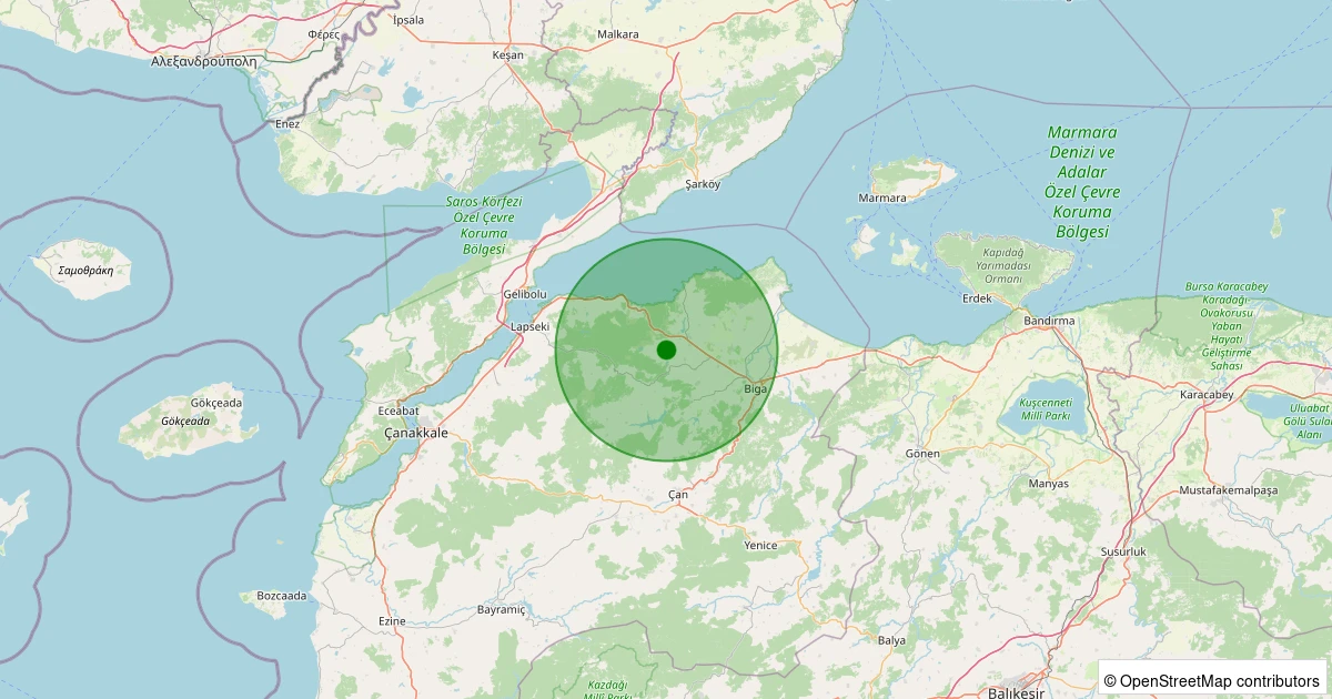 Son 7 gün içinde Biga - Çınardere Köyü noktasından 100 km yarıçap içerisinde meydana gelen diğer depremler: