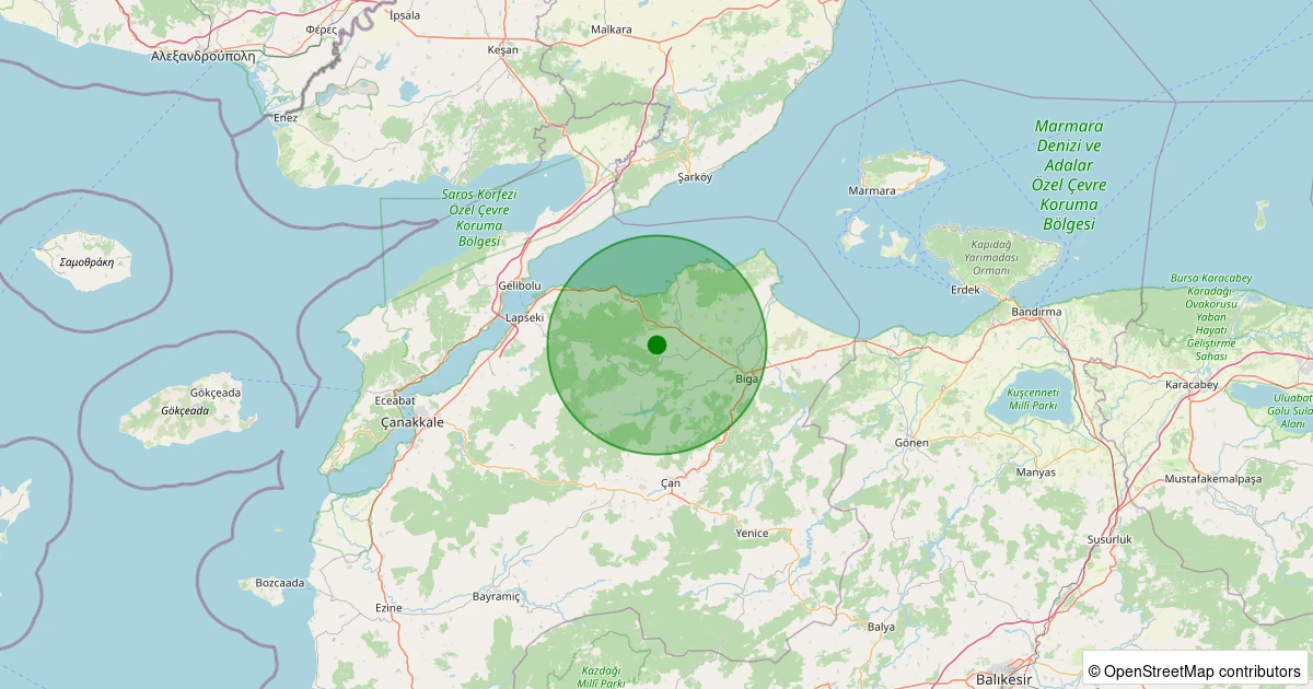 Son 7 gün içinde Biga - Gürgendere Köyü noktasından 100 km yarıçap içerisinde meydana gelen diğer depremler: