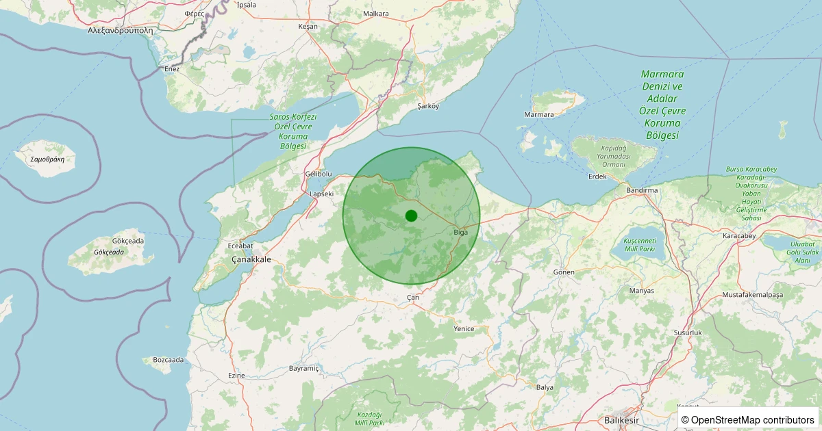 Son 7 gün içinde Biga - Hisarlı Köyü noktasından 100 km yarıçap içerisinde meydana gelen diğer depremler: