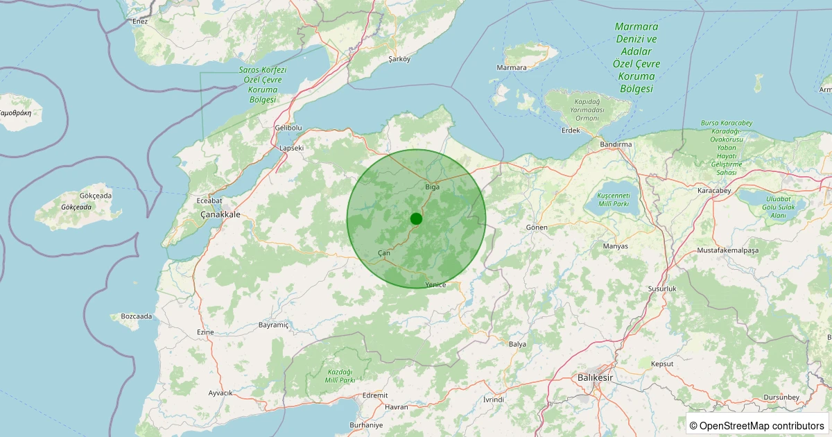 Son 7 gün içinde Biga - Kapanbelen Köyü noktasından 100 km yarıçap içerisinde meydana gelen diğer depremler: