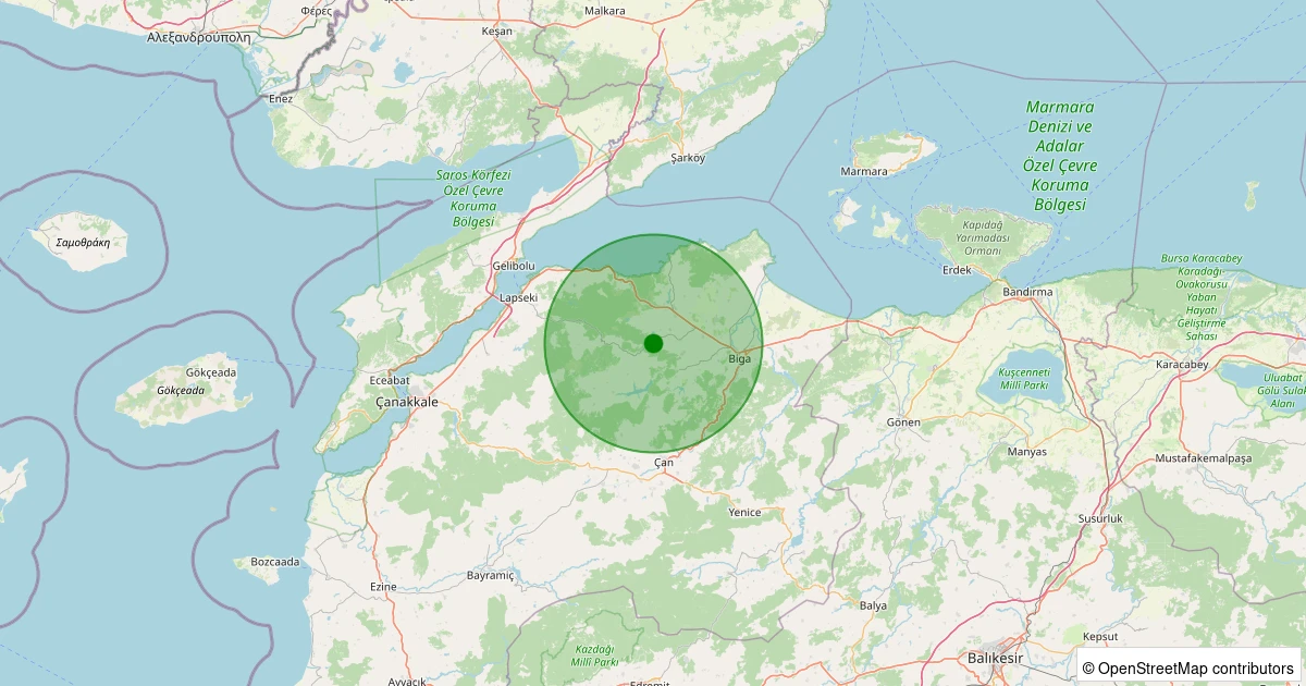 Son 7 gün içinde Biga - Kozçeşme Köyü noktasından 100 km yarıçap içerisinde meydana gelen diğer depremler: