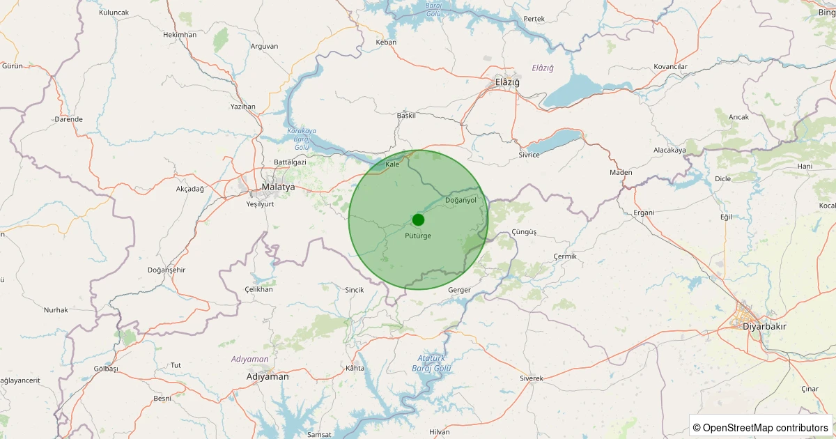 Son 7 gün içinde Pütürge - Çengelli Köyü noktasından 100 km yarıçap içerisinde meydana gelen diğer depremler: