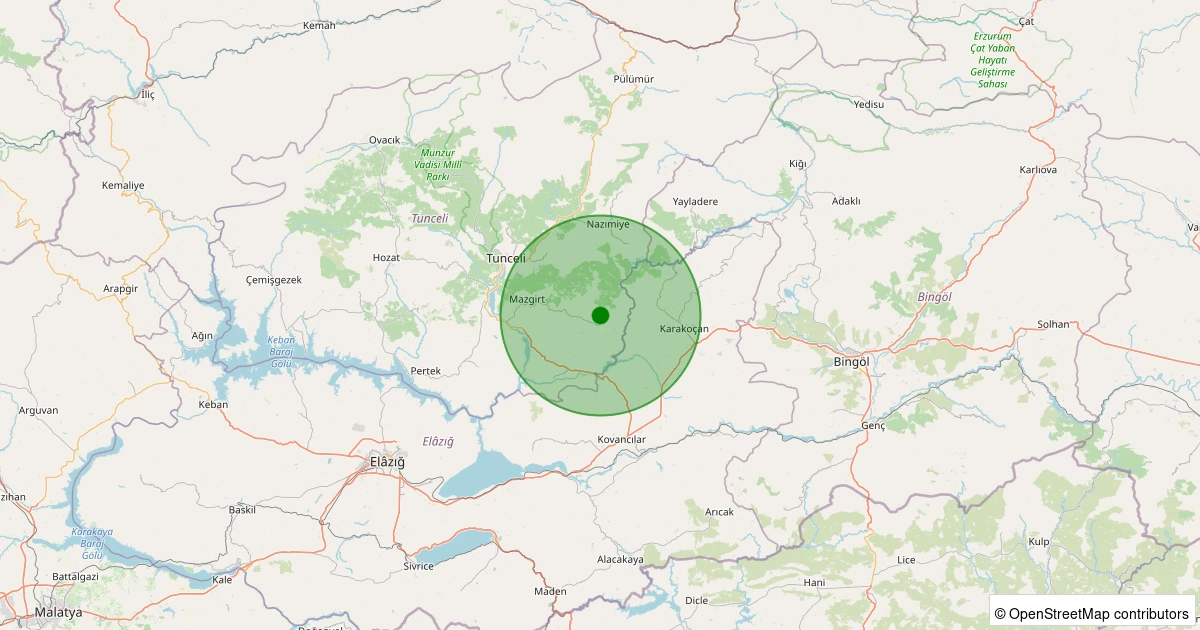 Son 7 gün içinde Mazgirt - Muhundu (Darıkent) Köyü noktasından 100 km yarıçap içerisinde meydana gelen diğer depremler: