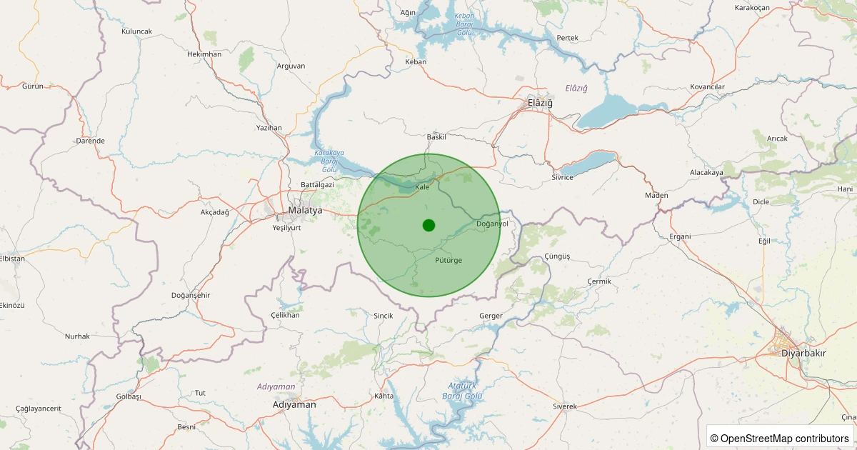 Son 7 gün içinde Pütürge - Karşıyaka Köyü noktasından 100 km yarıçap içerisinde meydana gelen diğer depremler: