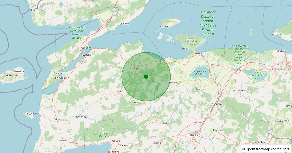 Son 7 gün içinde Biga - Camialan Köyü noktasından 100 km yarıçap içerisinde meydana gelen diğer depremler: