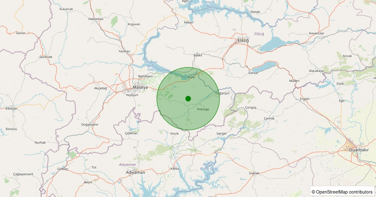 Son 7 gün içinde Pütürge - Pazarcık Köyü noktasından 100 km yarıçap içerisinde meydana gelen diğer depremler:
