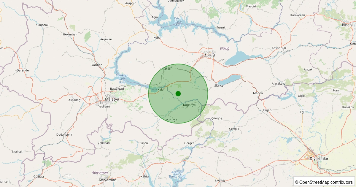 Son 7 gün içinde Baskil - Hacıhüseyinler Köyü noktasından 100 km yarıçap içerisinde meydana gelen diğer depremler: