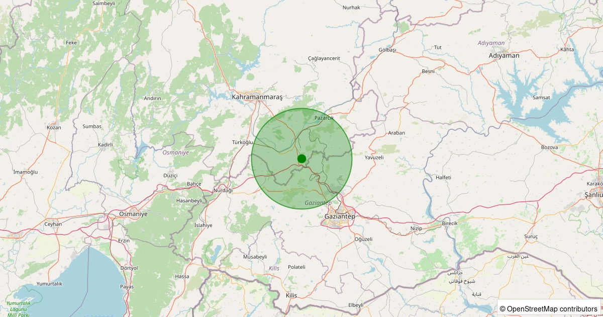 Son 7 gün içinde Pazarcık - Karabıyıklı noktasından 100 km yarıçap içerisinde meydana gelen diğer depremler: